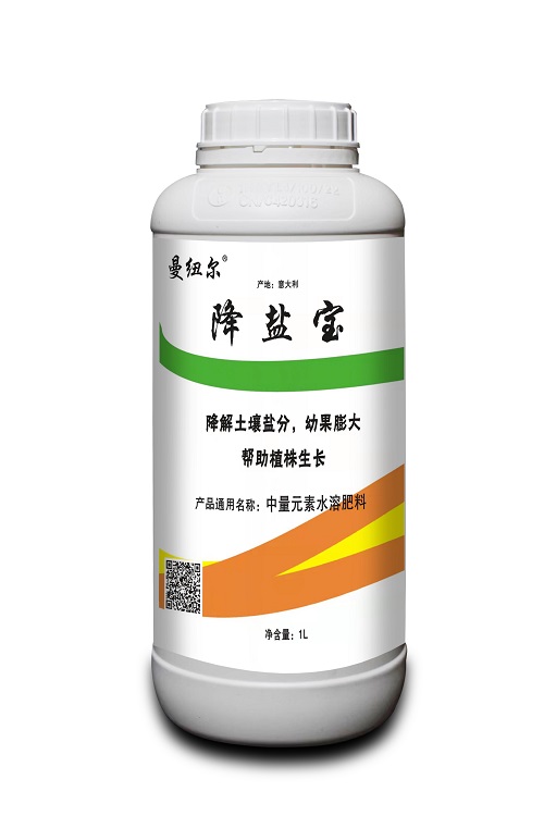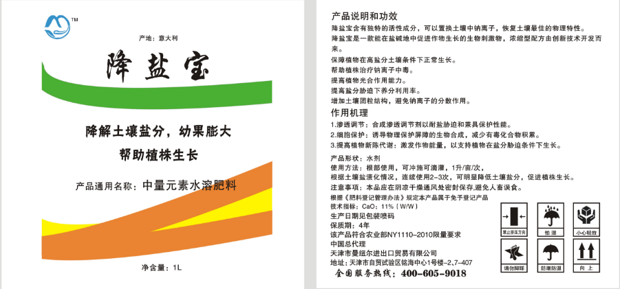 1.渗透调节:合成渗透调节剂以耐盐胁迫和兼具保护性能。2.细胞保护:诱导物理保护屏障的生物合成,减少有毒化合物积累。3.提高植物新陈代谢:激发作物能量,以支持植物在盐分胁迫条件下生长。产品形状:水剂使用方法: 根部使用,可冲施可滴灌,1升/亩/次,根据土壤盐渍化情况,连续使用2-3次,可明显降低土壤盐分,促进植株生长。注意事项:本品应在阴凉干燥通风处密封保存,避免人畜误食。根据《肥料登记管理办法》规定本产品属于免予登记产品技术指标: CaO:11%(W/W)生产日期见包装喷码保质期:4年该产品符合农业部NY1110-2010限量要求禁止挤压方向中国总代理天津市曼纽尔进出口贸易有限公司地址:天津市自贸试验区铭海中小1号楼-27-407请勿脚踩防潮防湿全国服务热线:400-605-9018